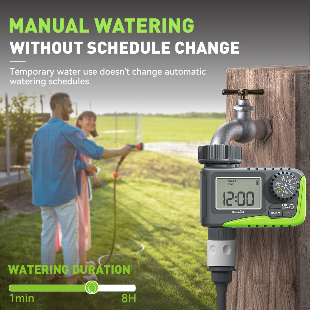 Με τη χειροκίνητη λειτουργία, μπορείτε να ποτίζετε τα λουλούδια και τα φυτά σας όποτε θέλετε, χωρίς να διακόπτετε το πρόγραμμά σας (η διάρκεια ποτίσματος μπορεί να προσαρμοστεί από 1 λεπτό έως 8 ώρες).