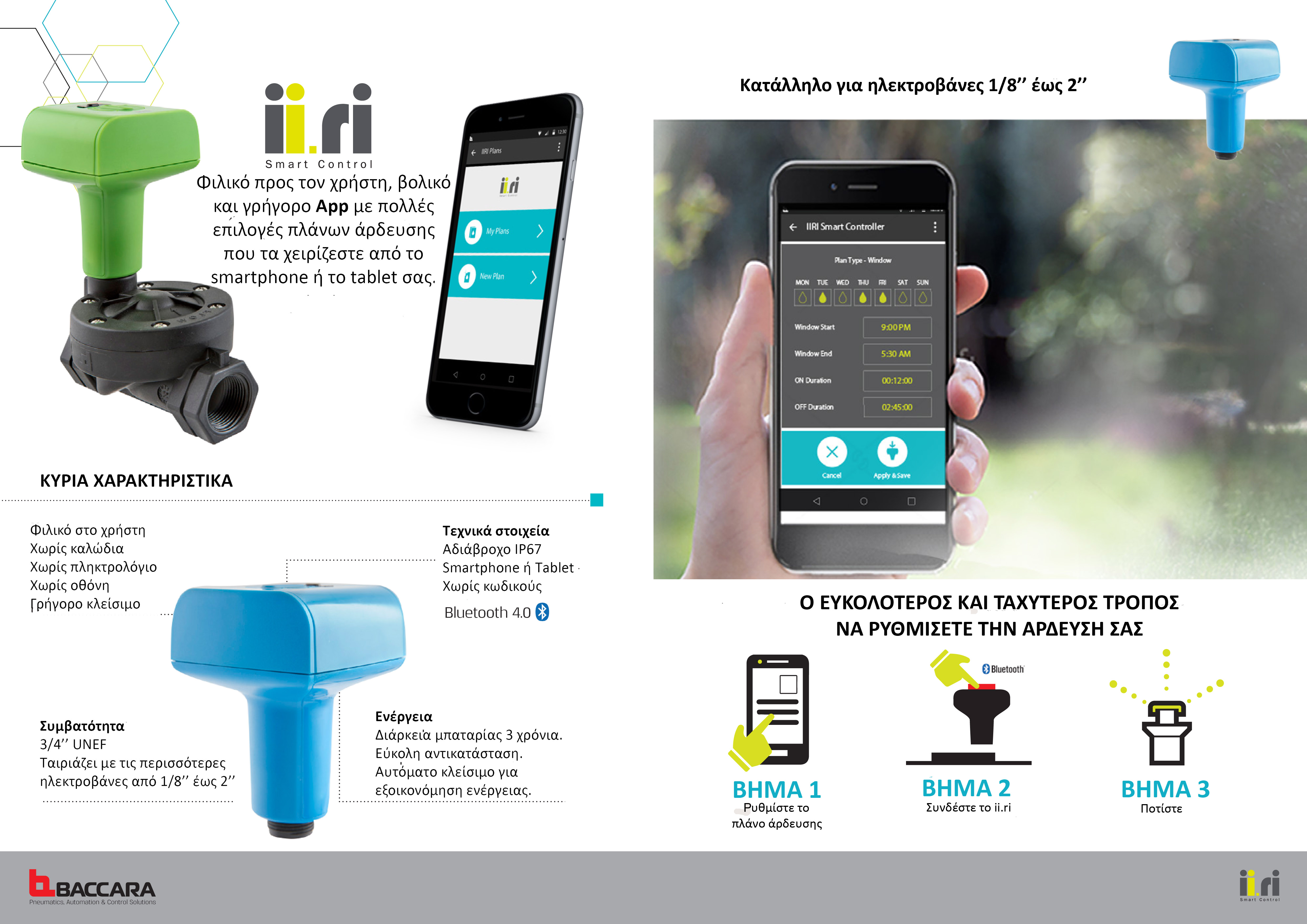 Ο πλήρως αδιάβροχος προγραμματιστής IIRI της Baccara, διαθέτει ανεξάρτητη ηλεκτροβάνα και προγραμματίζεται πολύ εύκολα μέσω της εφαρμογής που θα βρείτε δωρεάν στο google play.